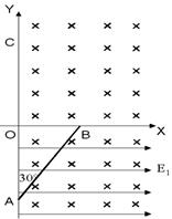 25.(22分)如图所示,直角坐标系XOY位于竖直平面内,在竖直的Y轴右侧存在垂直XOY平面向里的匀强磁场,磁感应强度B=1T,在第四象限有一个水平向右的匀强电场E1,E1=