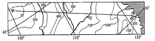 下面的某区域图中,点虚线是年等降水量线,读图回答8-9题。