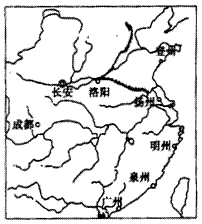 右图中的长安、洛阳、扬州、成都、广州、泉州、明州、登州被称为唐代八大城市。由此可以获取的正确历史信息有( )
