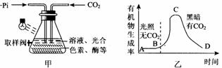 21.科学家在研究光合作用时,做了一个如下图所示的实验。实验前,他向一个密闭容器的溶液中加进了ADP、磷酸盐、光合色素及有关的酶等(见图甲)。实验时,按图乙的限制条件(光照、CO2等)进行,并不断测定有机物的生成率。随着时间的推移,绘出了曲线图(见图乙)。下列对此有关的描述不正确的是( )
