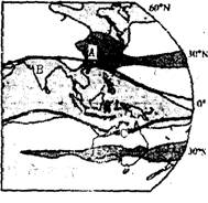 读世界部分地区图,图中阴影为地面季风的地理分布区,据此完成8-9题。