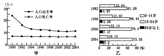材料二:甲图“某省人口出生率、死亡率变化”和乙图“人口年龄结构变化”
