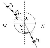 (1)如图所示,某同学用插针法测定一半圆形玻璃砖的折射率.在平铺的白纸上垂直纸面插大头针P1、P2确定入射光线,并让入射光线过圆心O,在玻璃砖(图中实线部分)另一侧垂直纸面插大头针P3,使P3挡住P1、P2的像,连接O P3.图中MN为分界面,虚线半圆与玻璃砖对称,B、C分别是入射光线、折射光线与圆的交点,AB、CD均垂直于法线并分别交法线于A、D点.
