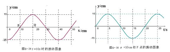14.(8分)图6-29为某波动在t =10s时的图像,图6-30为图1中x =10cm处P点的振动图像。根据图示信息回答下列问题。