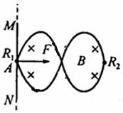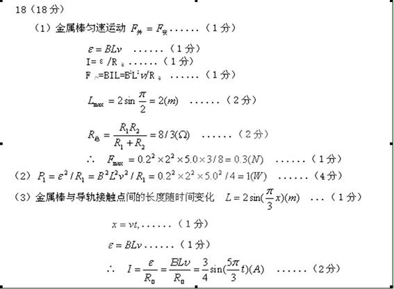 江苏省扬州中学2010届高三综合练习如图所示,在磁感应强度为B=2T,方向垂直纸面向里的匀强磁场中,有一个由两条曲线状的金属导线及两电阻(图中黑点表示)组成的固定导轨,两电阻的阻值分别为R1=3Ω、R2=6Ω,两电阻的体积大小可忽略不计,两条导线的电阻忽略不计且中间用绝缘材料隔开,导轨平面与磁场垂直(位于纸面内),导轨与磁场边界(图中虚线)相切,切点为A.现有一根电阻不计、足够长的金属棒MN与磁场边界重叠,在A点对金属棒MN施加一个方向与磁场垂直、位于导轨平面内的并与磁场边界垂直的拉力F,将金属棒MN以速度v=5m/s匀速向右拉,金属棒MN与导轨接触良好,以切点为坐标原点,以F的方向为正方向建立x轴,两条导线的形状符合曲线方程