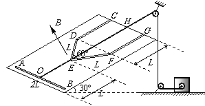 。一根质量为m的导体棒AB在电机牵引下,以恒定速度v0沿OH方向从斜面底端开始运动,滑上导轨并到达斜面顶端, AB⊥OH。金属导轨的CD、FG段电阻不计,DEF段与AB棒材料与横截面积均相同,单位长度的电阻均为r,O是AB棒的中点,整个斜面处在垂直斜面向上、磁感应强度为B的匀强磁场中。求:
