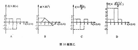 题型1.(楞次定律的应用和图像)如图甲所示,存在有界匀强磁场,磁感应强度大小均为B,方向分别垂直纸面向里和向外,磁场宽度均为L,在磁场区域的左侧相距为L处,有一边长为L的正方形导体线框,总电阻为R,且线框平面与磁场方向垂直. 现使线框以速度v匀速穿过磁场区域. 以初始位置为计时起点,规定电流逆时针方向时的电流和电动势方向为正,B垂直纸面向里时为正,则以下关于线框中的感应电动势、磁通量、感应电流、和电功率的四个图象描述不正确的是 ( )