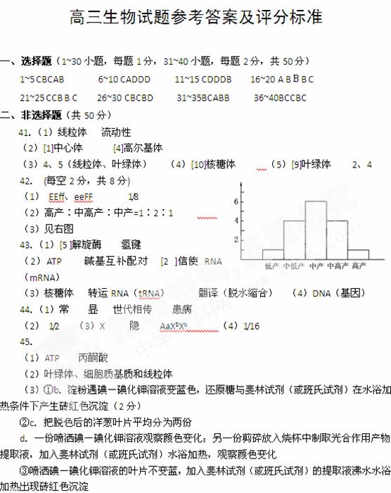 (3)请在右图中画出F2中的高产、中高产、中产、中低产、低产五个品系性状分离比的柱状图。(4分)