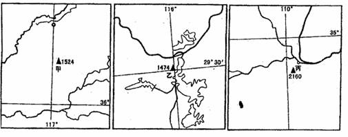 图中甲、乙、丙三山均为我国著名的旅游名山,读后回答3-5题。