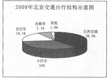 某中学生英语报开展展征文活动,主题为“2009年北京的交通状况”。下面的图表是2009年北京交通出行结构示意图。请结合图表内容,用英语写一篇简要的报告,并就某个数据说说你的观点,参加征文活动。词数不少于60。