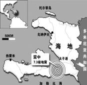 右图是海地地图。加勒比海岛国海地当地时间2010年1月12日下午4点53分发生里氏7.3级强烈地震,震源深度约10公里,震中离海地首都太子港只有15公里。海地位于加勒比板块和北美板块交界处,海地地震是由于沿着加勒比海板块和北美洲板块之间的断层所引起。这次地震预计将影响300万人,海地总理在接受采访时表示,地震造成的死亡人数最终可能“超过10万人”,造成严重的人员和财产损失。