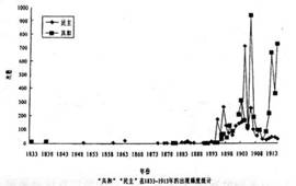 54.下图为1833-1915年“共和”、“民主”这两个关键词在部分著作和报刊中出现频率的统计图。1905-1913年间“共和”出现的频率远远高于“民主”的频率,其原因包括
