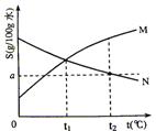 4、右图是M、N两种物质的溶解度曲线,在t2℃时往盛有100g水的烧杯中先后加入