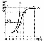 种群在理想环境中,呈J型曲线增长(图中曲线甲);在有环境阻力条件下,呈S型曲线增长(图中曲线乙)。下列有关种群增长曲线的叙述正确的是 ( )