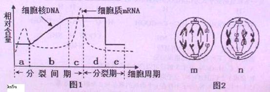 (3)图1表示细胞分裂各阶段细胞核中DNA和细胞质中mRNA含量的变化,图2是同一种生物体内两个细胞分裂的图像。图1中d、e阶段细胞质中mRNA明显减少,最可能的原因是原有的mRNA不断被水解,还因为______ ;图2中m细胞处于图1中的时期和上表中的时期分别是______ (填字母),m细胞中染色体组数和n细胞中染色单体数分别是______、______ 。