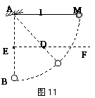 湖北省襄樊四中2010届高三摸底考试如图11所示,质量为m的小球,由长为l的细线系住,细线的另一端固定在A点,AB是过A的竖直线,E为AB上的一点,且AE=0.5l,过E作水平线EF,在EF上钉铁钉D,若线能承受的最大拉力是9mg,现将小球拉直水平,然后由静止释放,若小球能绕钉子在竖直面内做圆周运动,不计线与钉子碰撞时的能量损失.求钉子位置在水平线上的取值范围.