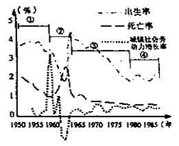 右图为中国人口变化图(人口自然增长率-城镇社会劳动力增长率=社会剩余劳动力增长率)。读图回答11-12题。