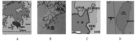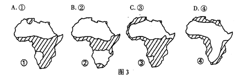6.依图2,若按年降水量>500mm为地表水资源较丰富区,年降水量<500mm为地表水资源缺乏区,绘制非洲地表水资源分布示意图。下面四幅图(图3)中绘制较为准确的是 ( )