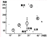 图4显示我国一些主要城市的纬度与海拔高度,读图完成7-8题。