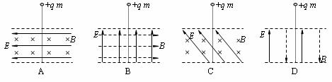 21. 如下图所示,两虚线之间的空间内存在着正交或平行的匀强电场E和匀强磁场B,有一个带正电小球(电量为+q,质量为m)从正交或平行的电磁混合场上方的某一高度自由落下,那么,带电小球可能沿直线通过下列的哪个电磁混合场