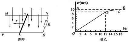 14、(15分)如图甲所示,空间存在B=0.5T,方向竖直向下的匀强磁场,MN、PQ是相互平行的粗糙的长直导轨,处于同一水平面内,其间距L=0.2m,R是连在导轨一端的电阻,ab是跨接在导轨上质量m=0.1kg的导体棒,从零时刻开始,通过一小型电动机对ab棒施加一个牵引力F,方向水平向左,使其从静止开始沿导轨做加速运动,此过程中棒始终保持与导轨垂直且接触良好,图乙是棒的速度一时间图像,其中OA段是直线,AC是曲线,DE是曲线图像的渐近线。小型电动机在12s末达到额定功率P额=4.5W,此后功率保持不变,除R以外,其余部分的电阻均不计,g=10 m/s2