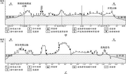 图4中甲图为非洲和欧洲大陆从赤道向两极,以及山地从山麓向山顶自然带的地域分异示意图,乙图为亚欧大陆从沿海向内陆以及山地由山麓向山顶自然带的地域分异示意图。完成7~9题。