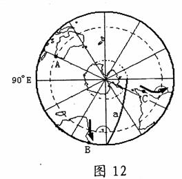 图12为“南半球海陆分布示意图”,图中a表示晨线,箭头表示洋流的分布位置及流向。读图,回答下列问题![]()