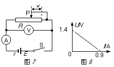 ②第二组同学也利用图7的连接测量另一节干电池,初始时滑片P在最右端,但由于滑动变阻器某处发生断路,合上电键后发现滑片P向左滑过一段距离x后电流表有读数,于是该组同学分别作出了电压表读数U与x、电流表读数I与x的关系图,如图9所示,则根据图像可知,电池的电动势为 V,内阻 W。