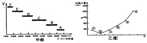 研究人员依据我国多年平均气候资料,接一定方向分别选取了A→F和①→⑥共十二个地区的数值,分类绘成甲、乙两图。读图完成3-4题。