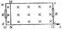 20.如图,矩形裸导线框abcd的长边长度为2L,短边的长度为L,在两短边上均接有电阻R,其余部分电阻不计。导线框一长边与x轴重合,左边的坐标x=0,线框内有一垂直于线框平面的匀强磁场,磁场的磁感应强度为B。一质量为m、电阻也为R的光滑导体棒MN与短边平行且与长边接触良好。开始时导体棒静止于x=0处,从t=0时刻起,导体棒MN在沿x轴正方向的一个拉力作用下,从x=0处匀加速运动到x=2L处。则导体棒MN从x=0处运动到x=2L处的过程中通过导体棒的电量为 ( )