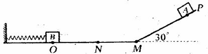 如图所示,在水平滑道的右端与斜面滑道平滑相接,整个滑道除M、N间粗糙外,其余滑道均光滑。现将一个弹簧振子安装在水平滑道的左端.0点是振子B的平衡位置。让滑块A从斜面P处以初速度为