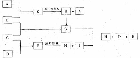 已知A、B、C、D为四种单质,常温时,A、B是气体,C、D是固体且D显淡黄色。E、F、G、H、I为五种化合物,E为气体且极易溶于水成为无色溶液,F不溶于水,G溶于水得黄棕色溶液。这九种物质间反应的转化关系如下图所示: