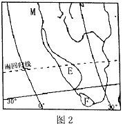 3.该图有关大气运动形势的叙述正确的是 ( ) A.P气流为两北风 B.E处的降水多为对流雨 C.H处因热力作用形成高气压 D.E到F自然带更替的士导因素是热量 4.图示时段 ( ) A.我国东北地区昼长夜短 B.巴阳高原热带草原进入早季 C.南极地区科学考察进入最佳时期 D.地中海地区正午太阳高度达到一年中的最大值 图2为“非洲部分区域简图”,读图回答5-7题。
