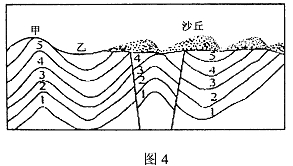 8.图4为“我国西北某地地质、地形剖面图”,图中l、2、3、4、5为地层编号,并表示地层年代由老到新。下列叙述不正确的是 ( )