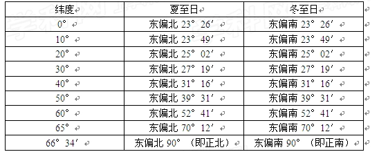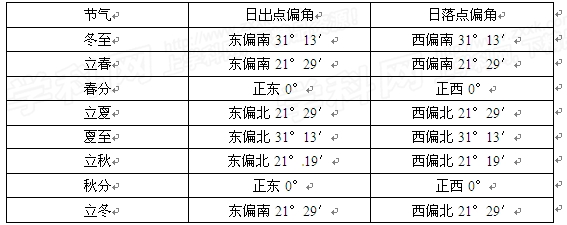表二:北京(39°54′N)不同日期的日出、日落点偏角