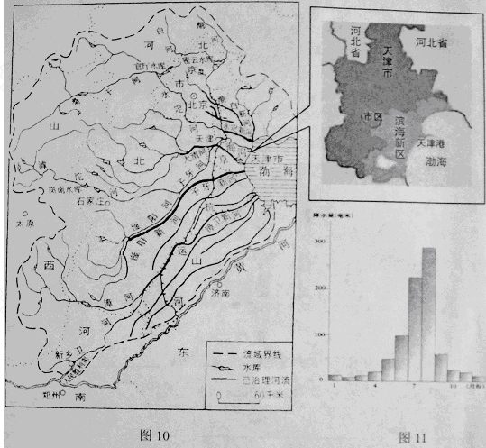 (3)江苏某校地理研究性学习小组,分别观测了学校旗杆日出时的影子OM和正午的影子ON之间夹角--∠MON的变化情况,在6月份观测到∠MON的变化规律是 ;赤道上∠MON全年的变化范围是 。 28.图10为“海河流域示意图”,图11为“海河流域全年各月降水量分配图”,读图回答下列问题。(15分)