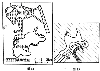 (3)图15所示为澳门某处海湾,在发展规划中A、B、C、D为规划土地,A、B两地可否建港