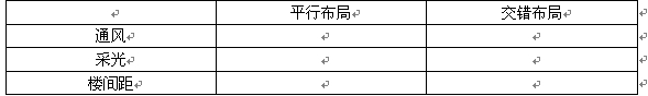(3)该大型居住区楼房有平行布局、交错布局等,试对两种布局的住宅通风、采光、楼间距进行比较。