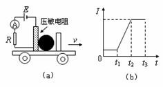 福建省厦门外国语学校2010届高三第三次月考压敏电阻的阻值随所受压力的增大而减小,某位同学利用压敏电阻设计了判断小车运动状态的装置,其工作原理如图(a)所示,将压敏电阻和一块挡板固定在绝缘小车上,中间放置一个绝缘重球。小车向右做直线运动过程中,电流表示数如图(b)所示,下列判断正确的是 ( D