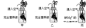取三株生长发育状况相同,长势良好的番茄植株,在甲、乙、丙三个装置中培养,其中乙装置中的植株去掉枝条上的全部叶片。甲、乙、丙装置中盛有等量的营养液(见右图)。三个装置在相同的适宜条件下培养。请分析回答下列问题: