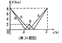 24、(本小题满分10分)在一次远足活动中,某班学生分成两组,第一组由甲地匀速步行到乙地后原路返回,第二组由甲地匀速步行经乙地继续前行到丙地后原路返回,两组同时出发,设步行的时间为t(h),两组离乙地的距离分别为S1(km)和S2(km),下图中的折线分别表示S1、S2与t之间的函数关系.