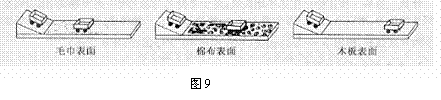 21、在探究牛顿第一定律的实验中,如图9所示用同一小车从同样斜面的同一高度滑下,使它在三种不同表面的水平轨道上继续运