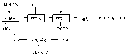 (10分) 孔雀石主要含Cu2(OH)2CO3,还含少量Fe、Si的化合物,实验室以孔雀石为原料制备CuSO4·5H2O及CaCO3,步骤如下: