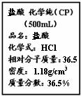 (8分) 右图为某市售盐酸试剂瓶标签上的部分数据。