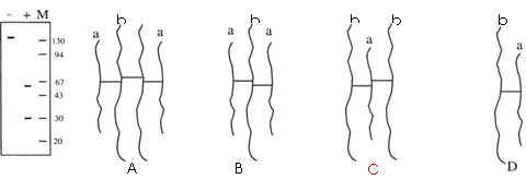 10.细菌蛋白质在极端环境条件下可通过肽链之间的二硫键维持稳定。已知不同的多肽产物可因分子量不同而以电泳方式分离。下列左图是一个分析细菌蛋白的电泳结果图,“-”代表没加还原剂,“+”代表加有还原剂,还原剂可打断二硫键,“M”代表某些已知分子量的蛋白质或多肽,M右侧的数字代表这些蛋白质或多肽的相对分子量。右图中的“-”代表二硫键。根据左侧结果,右图中最能代表该细菌蛋白质结构的是
