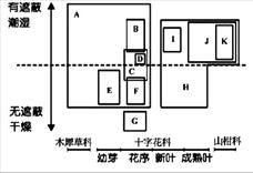 右图是11种昆虫A-K的栖息环境特性(Y轴)与寄主植物(X轴)的关系图,图中Y轴中点连线(虚线)表示对栖息环境无所偏好。根据图中的关系,下列选项中错误的是