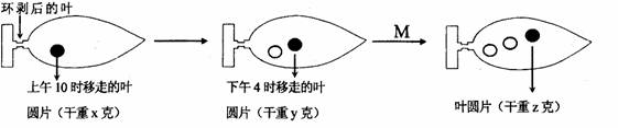 5.生物兴趣小组欲测定植物叶片中叶绿体的光合作用速率。做如图所示实验:在叶柄基部作环剥处理(仅阻止叶片有机物的输入和输出),再于不同时间分别在同一叶片上陆续取卜面积均为1cm2的叶圆片烘干后称其重量,测得叶片叶绿体的光合作用速率为(3y-2z-x)/6g·cm2·h-1(不考虑取下叶圆片后对叶片生理活动的影响,假设整个实验过程中温度保持不变)。则M处的实验条件是 ( )