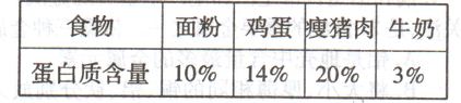 (2)小明在某天所吃的食物总量为:面粉250 g、鸡蛋25 g、瘦猪肉200 g、牛奶250 g、矿泉水1000 g、油脂10 g等。为了均衡营养,小明还应增加--类食物。世界卫生组织提出青少年每天摄人蛋白质的总量应该在85 g至100 g之间。请根据下表中几种常见食物的蛋白质含量,计算小明该天所摄入的蛋白质总量约为 g, (填“符合”或“不符合”)世界卫生组织的标准。![]()