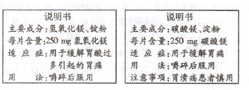 32.人的胃液里含有适量的盐酸,可以帮助消化,但如果胃酸分泌过多,人会感到胃痛。小明拿来了两种抗酸药(治疗胃酸过多的药物)。,这两种药物说明书的部分内容如右图所示。