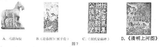 13.《美的历程》作者李泽厚先生认为“抽象几何纹饰并非某种形式美,而是:抽象形式中有内容,感官感受中有观念。……那些似乎是纯形式的几何线条,实际是从写实的形象演化而来,其内容(意义)已积淀(溶化)在其中,于是,才不同于一般的形式、线条,而成为有意味的形式。”根据此论断,图7中艺术作品审美倾向体现汉唐时期积极的时代精神的是 ( )
